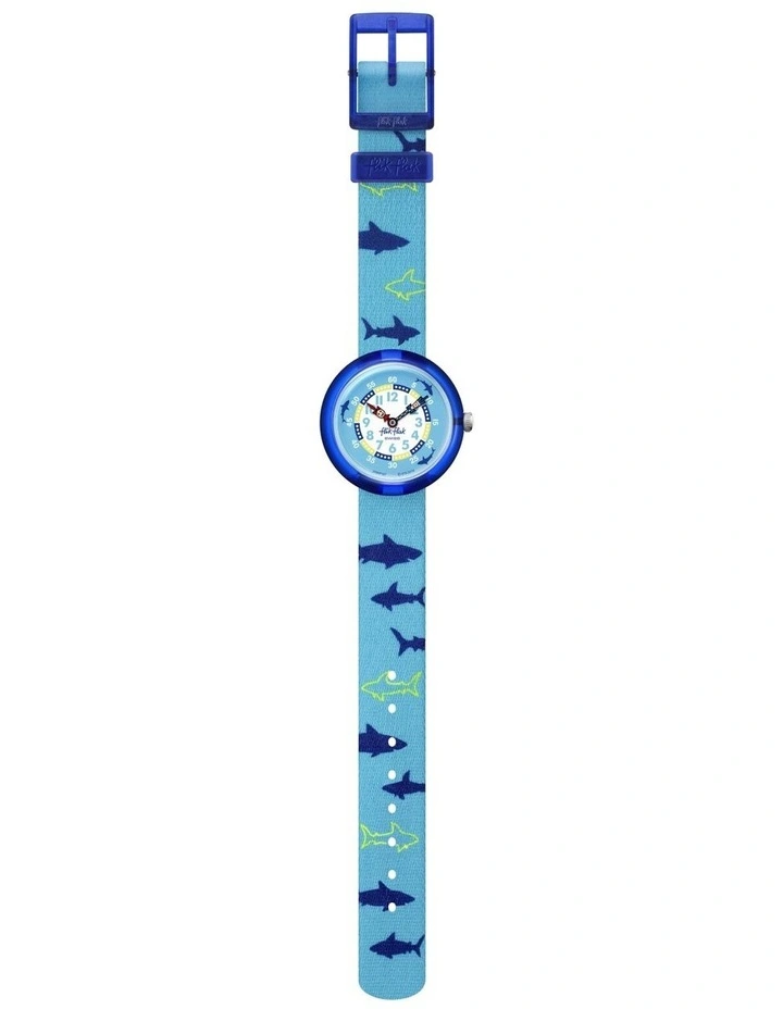 SHARKASM makes a bold statement thanks to its printed textile strap that’s complete with sharks swimming in the deep blue sea. Shock- and water-resistant for complete peace of mind, this Swiss made watch for kids makes learning to tell the time a crazy adventure! Case Width Millimetre 31.85 mm Thickness Millimetre : 9.25 mm Height Millimetre : 30.60 mm