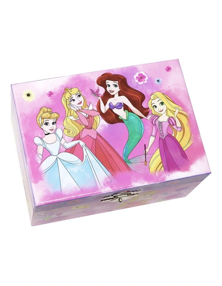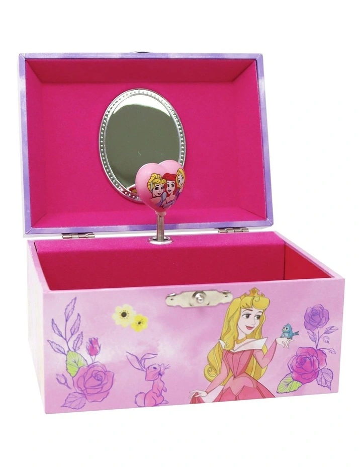 Your little royal will love to store their precious gems and accessories in this Musical Jewellery Box. Its simple easy-to-open and close lid, featuring the classic musical tune Sleeping Beauty, with a twirling printed heart shape figurine, a mirror underneath and spacious interior with flocked lining to protect your precious jewellery. Perfect keep all your treasures safe! Featuring detailed illustrations of 4 of your favourite Disney Princesses: Sleeping Beauty, Ariel, Rapunzel, & Cinderella.  Â