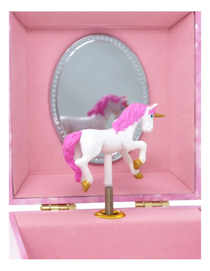 Features: Plays the tune ‘Dance of the Sugar Plum Fairy’. Oval Shaped Mirror Twirling Unicorn Figurine Pink Flocked Lining One Front Drawer for Extra Storage Gold tone fixtures