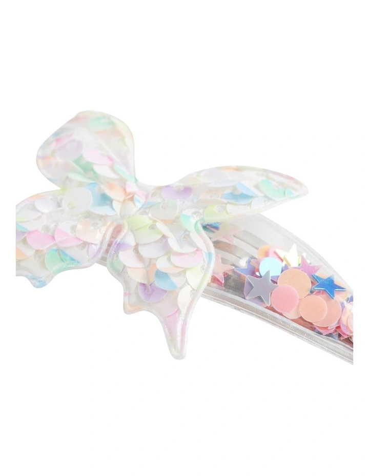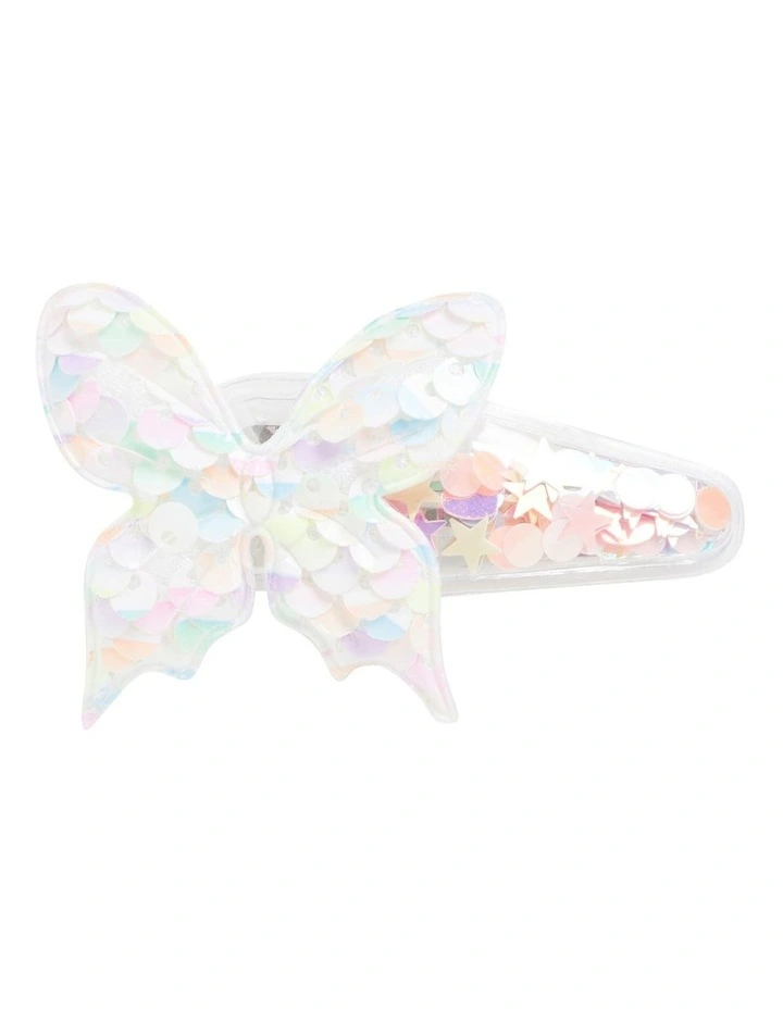Filled with multi-coloured sequins this butterfly shaped shaker clip adds a vibrant touch to any outfit. The butterfly is set on a snap clip that slides easily into the hair. This product is not a toy and is not suitable for children 3 years and under.