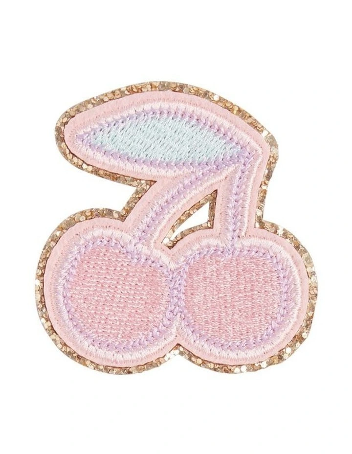 Add a bright touch to any look with this cherry patch. Featuring pink cherry motif outlined with golden sparkles, the textured, glittery patch adds a pop of colour to any outfit.
