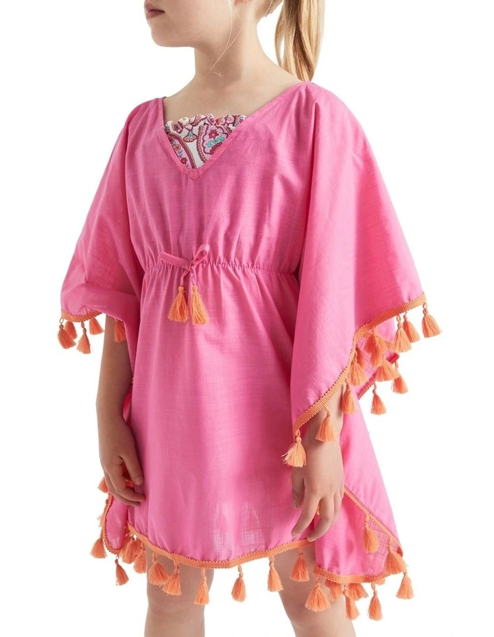 Ideal for throwing on over a bathing suit or summer outfit, this easy to wear cover up has a V neckline and short sleeves. The gathered waist gives shape, while contrast tassel details add a fun boho touch. Made from 100% cotton.