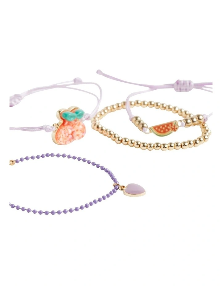Perfect for mixing and matching, this fruity bracelet set is a fun addition to any outfit. With beaded, fruit themed charms set onto a string of beautiful beads, the bracelets are an ideal gift. This product is not a toy and is not suitable for children 3 years and under.