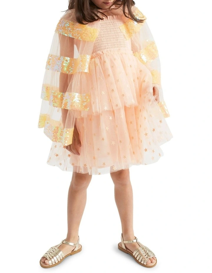 This enchanting cape comes complete with a star-shaped wand, for the party outfit of their dreams. With a tiered, frilly silhouette decorated with sequins, the cape closes at the elasticated neckline for regal look.