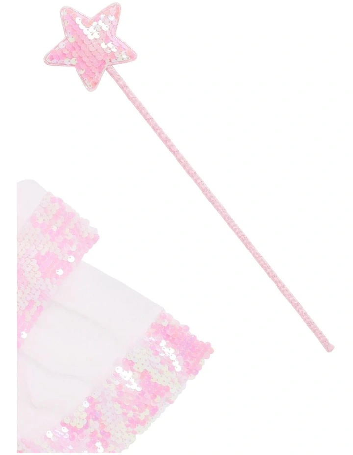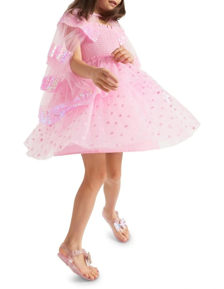 This enchanting cape comes complete with a star-shaped wand, for the party outfit of their dreams. With a tiered, frilly silhouette decorated with sequins, the cape closes at the elasticated neckline for regal look.