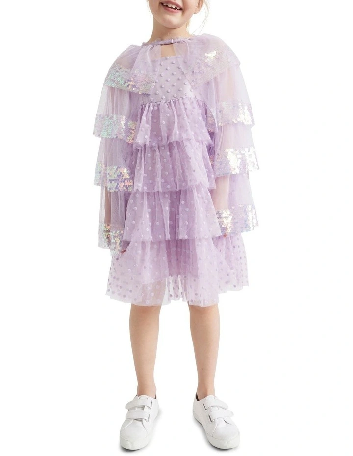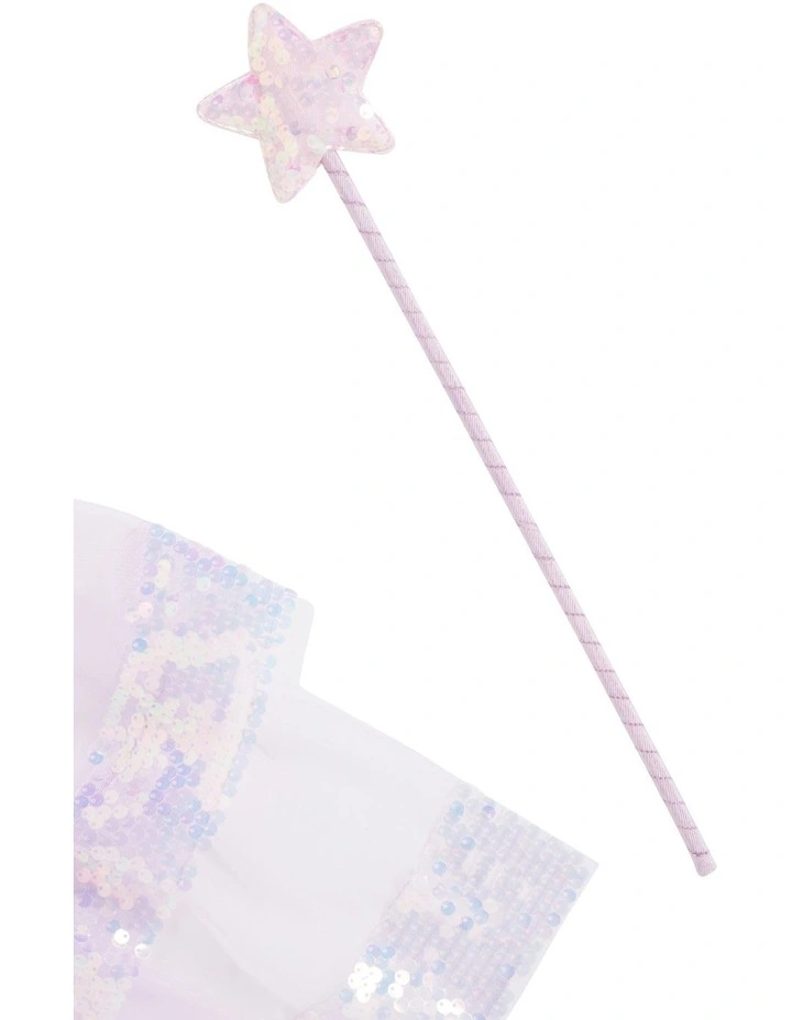 This enchanting cape comes complete with a star-shaped wand, for the party outfit of their dreams. With a tiered, frilly sillouhette decorated with sequins, the cape closes at the elasticated neckline for regal look.