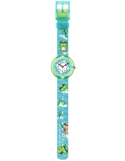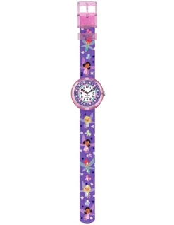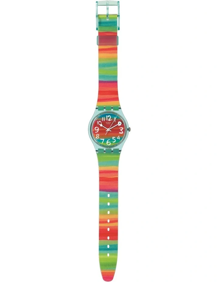 Swiss made, the Swatch watch COLOUR THE SKY (GS124) features a quartz movement, a plastic folio strap and a plastic watch head.