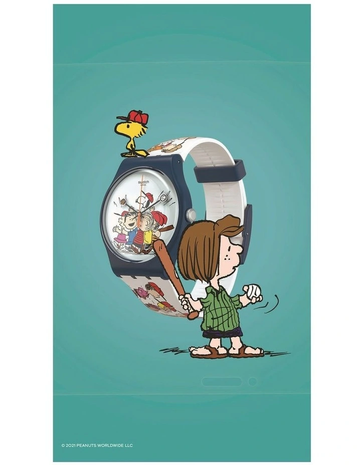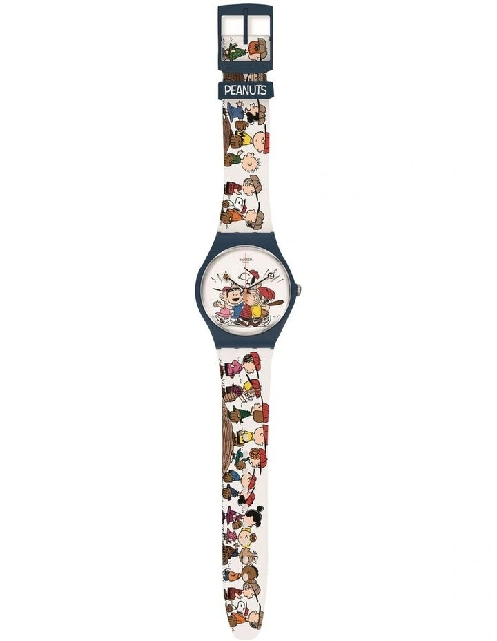 This lively Peanuts gang watch has a solid matte dark blue bio-sourced case that stands out against a solid matte white silicone strap with an allover print featuring the whole Peanuts gang. On this Swatch X Peanuts watch the multi-colored Peanuts print continues onto the white dial, with a baseball ball and baseball glove print on the watch hands. The solid matte dark blue silicone loop and plastic buckle add contrast to the design.
