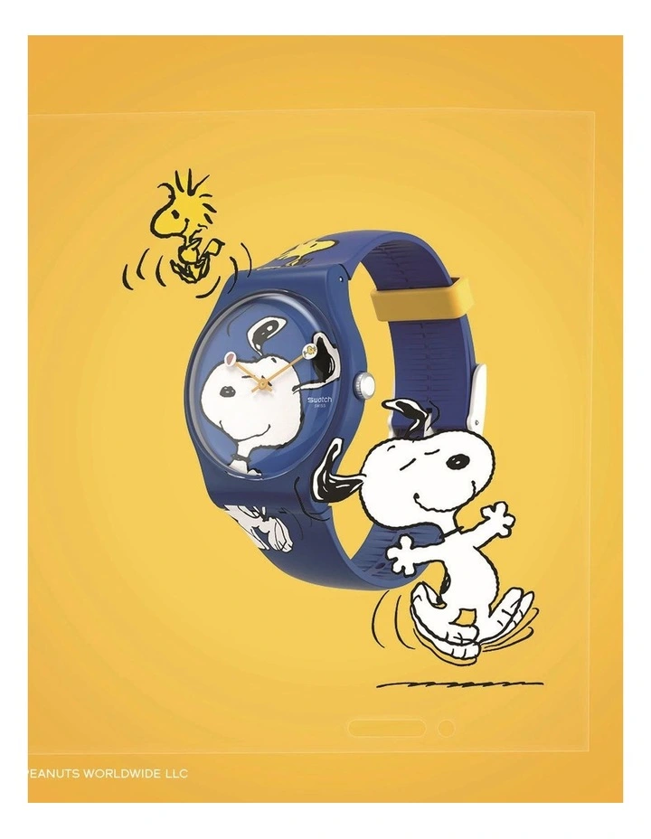 This Snoopy and Woodstock watch features a solid matte dark blue case in bio-sourced material and a matching silicone strap with an understated multi-colored print and solid matte white plastic buckle. On this Swatch X Peanuts watch, Snoopys face graces the dial, with yellow watch hands that include prints of Woodstock and a dog bowl. The solid matte yellow silicone loop adds an extra splash of color.