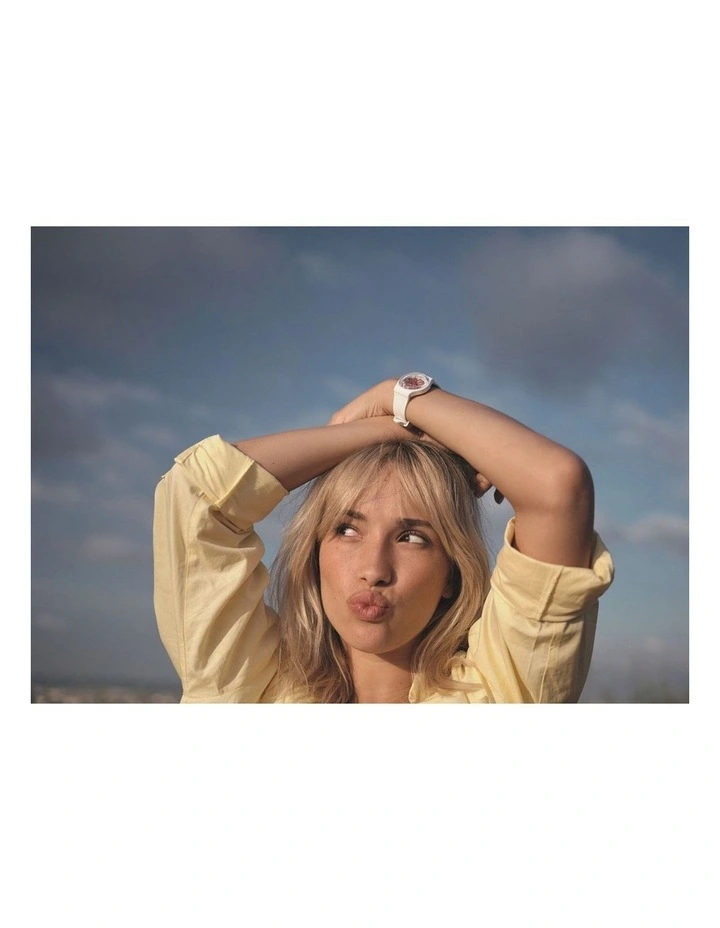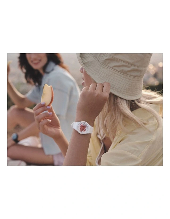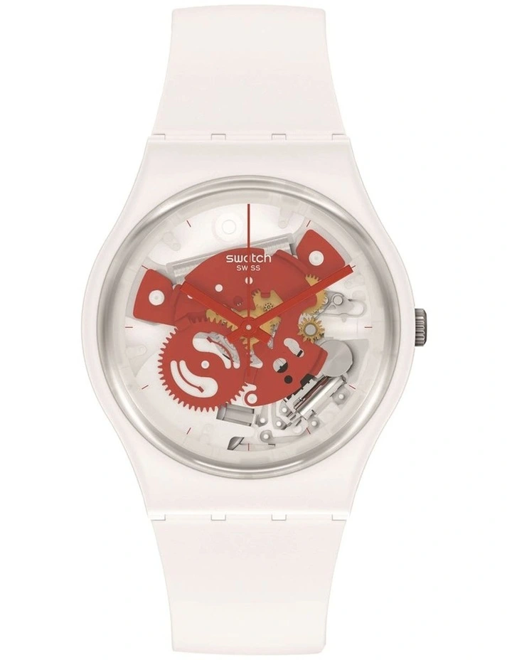 Crafted from bio-sourced materials and featuring a solid matte white strap, loop and buckle, with clear red print and red movement elements.